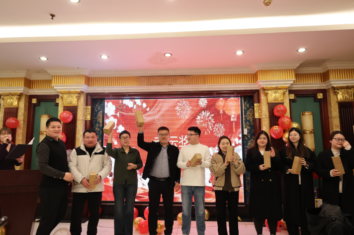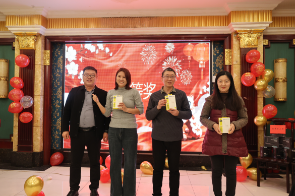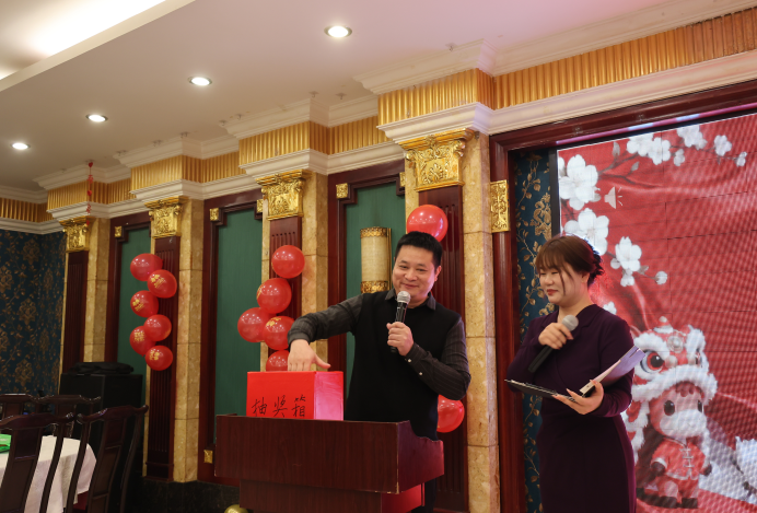 致辞尾声,最受期待的抽奖环节正式开启。本次年会的首个奖项 —— 幸运奖,将抽取8名幸运员工,由唐总从抽奖箱里依次抽取出获奖名单,当主持人念出中奖姓名时,获奖员工们满脸喜悦地登台领奖,这份突如其来的幸运为年会奠定了欢乐的基调。