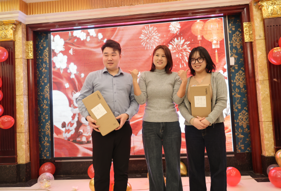 话音刚落,二等奖抽奖环节正式开启。本次二等奖共抽取2名员工,当从抽奖箱里抽出中奖名单后,主持人宣读过后,中奖员工们激动地走上舞台,接过属于自己的幸运奖品,这份惊喜让大家感受到了公司的贴心与关爱。
